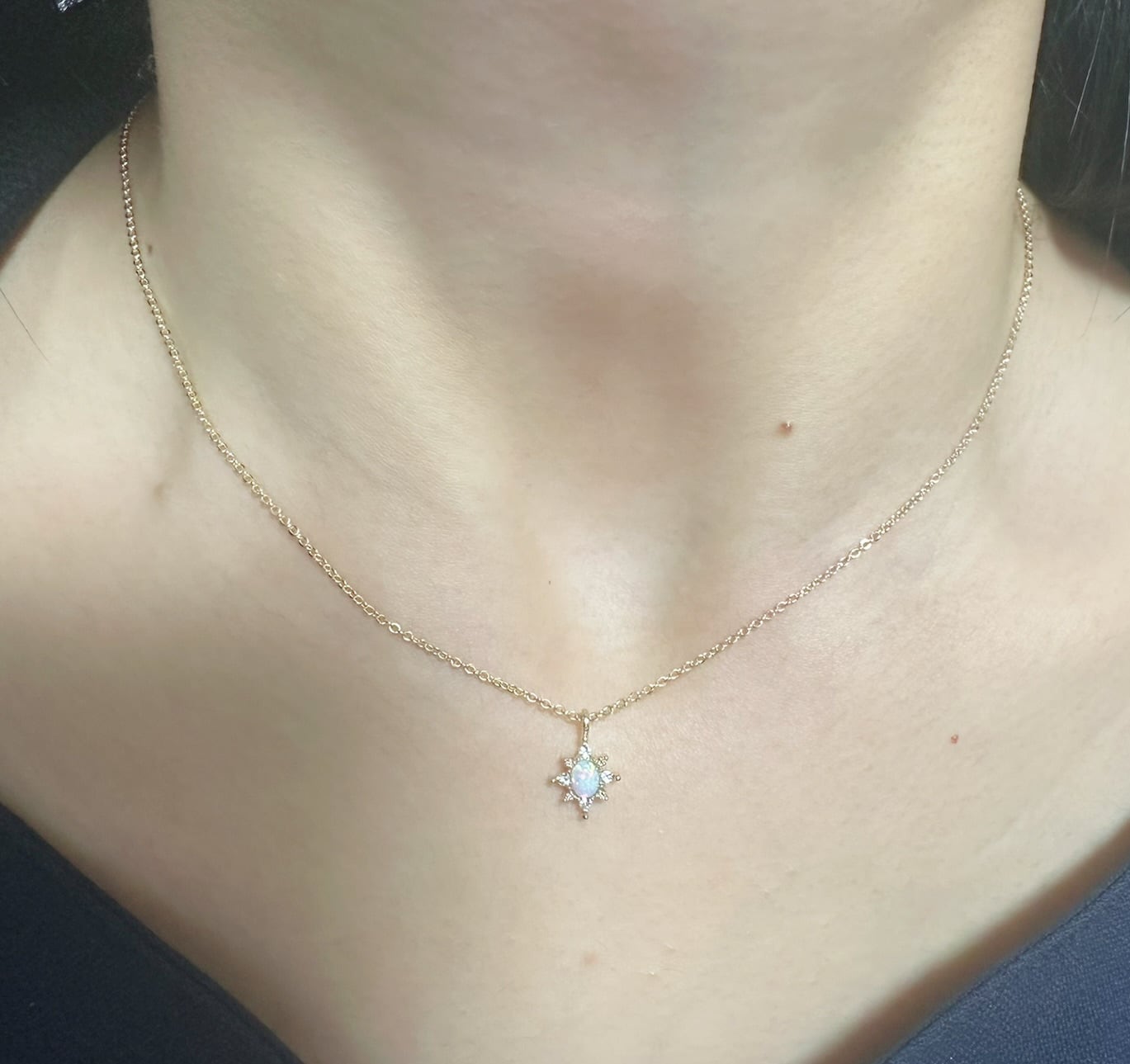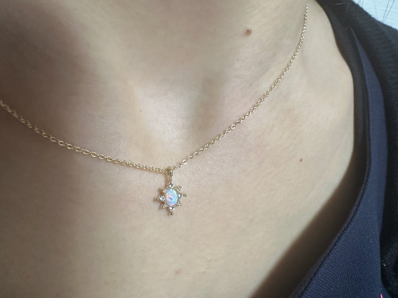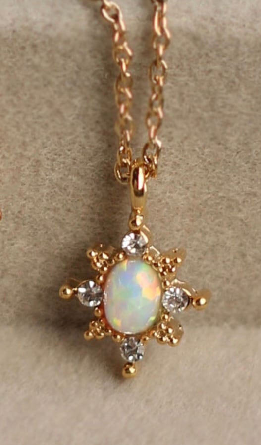 中央のオーバルオパールを中心に、周りを小さなマーキス型の輝きが囲むジュエリーのような華奢な作りで、首元を優しく彩ります。淡いユニコーンカラーが可愛らしく、どんなコーディネートにも自然に溶け込み、毎日着けたくなる逸品です。