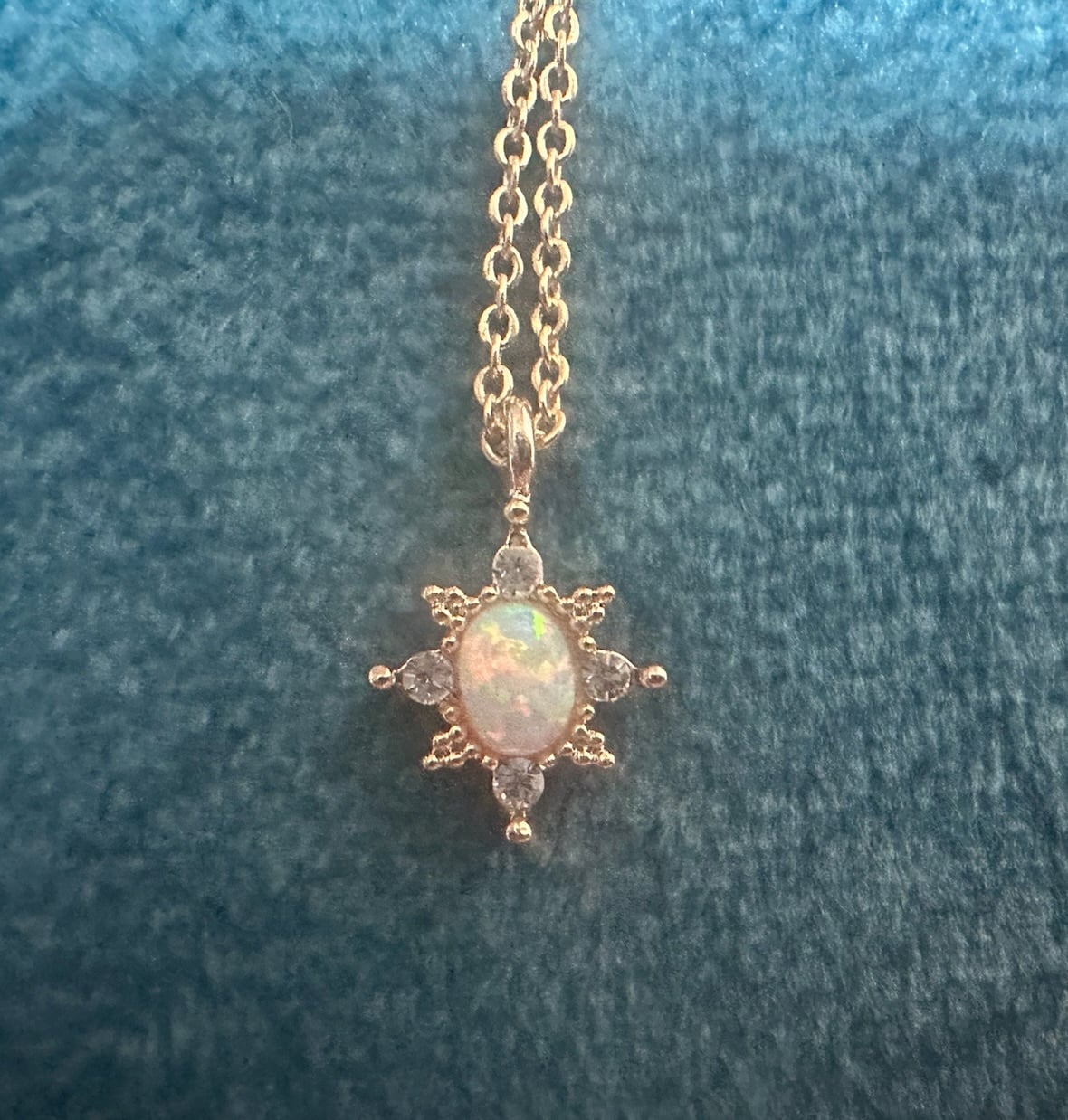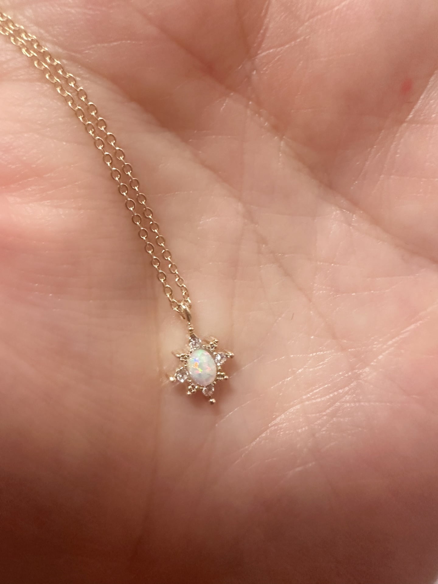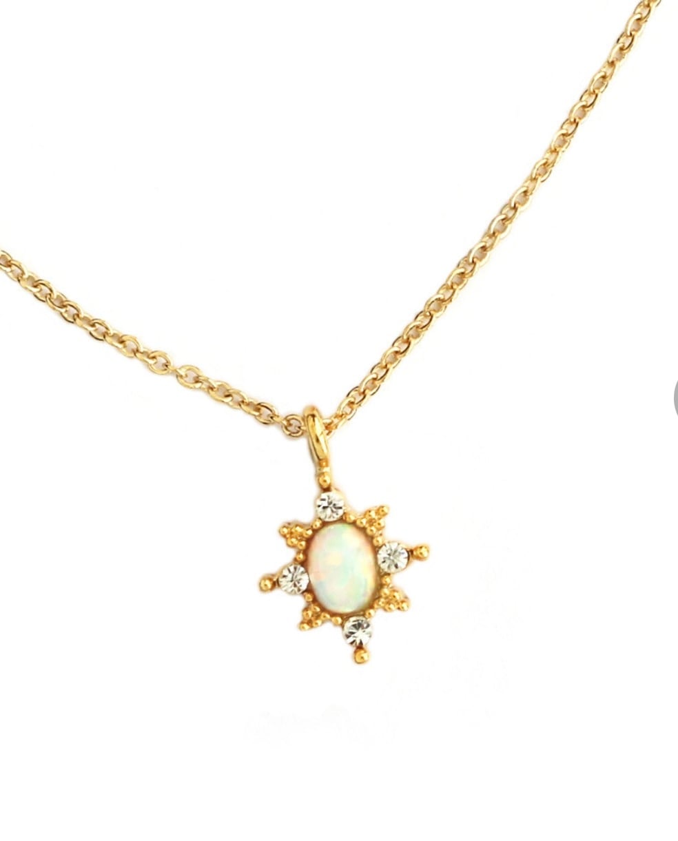 中央のオーバルオパールを中心に、周りを小さなマーキス型の輝きが囲むジュエリーのような華奢な作りで、首元を優しく彩ります。淡いユニコーンカラーが可愛らしく、どんなコーディネートにも自然に溶け込み、毎日着けたくなる逸品です。
