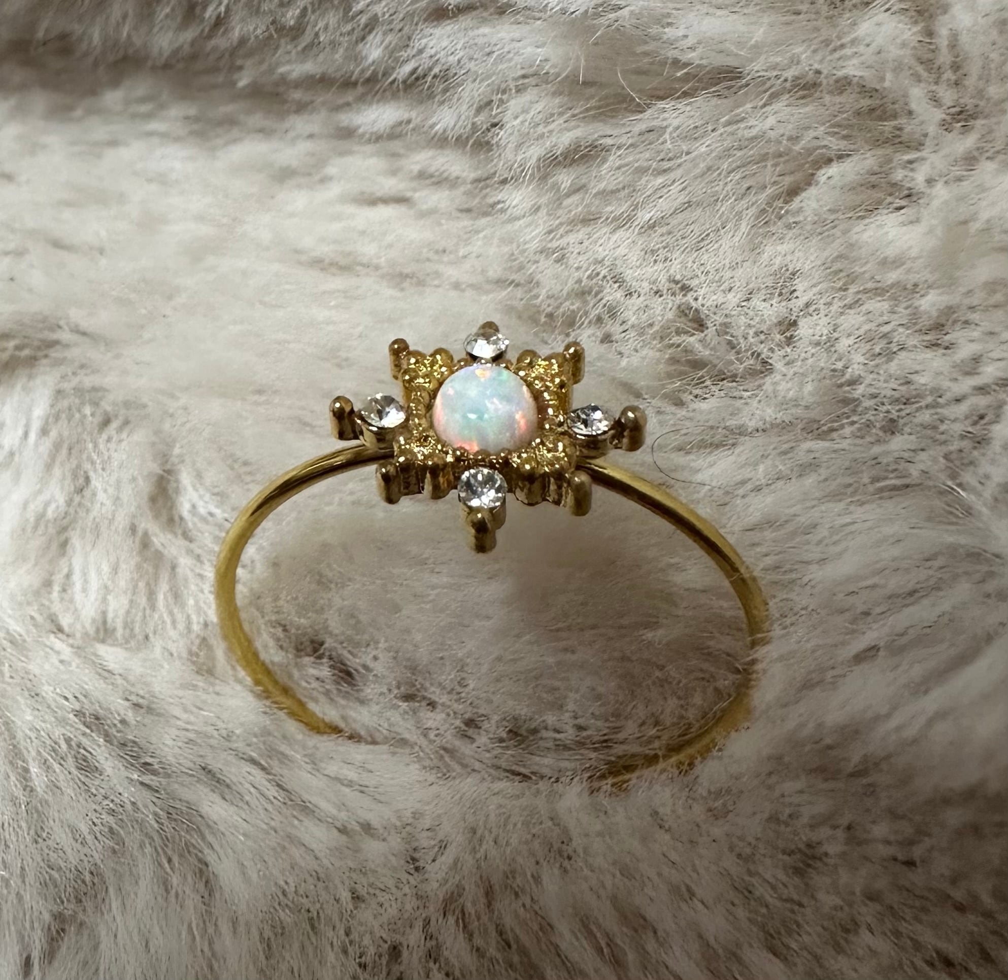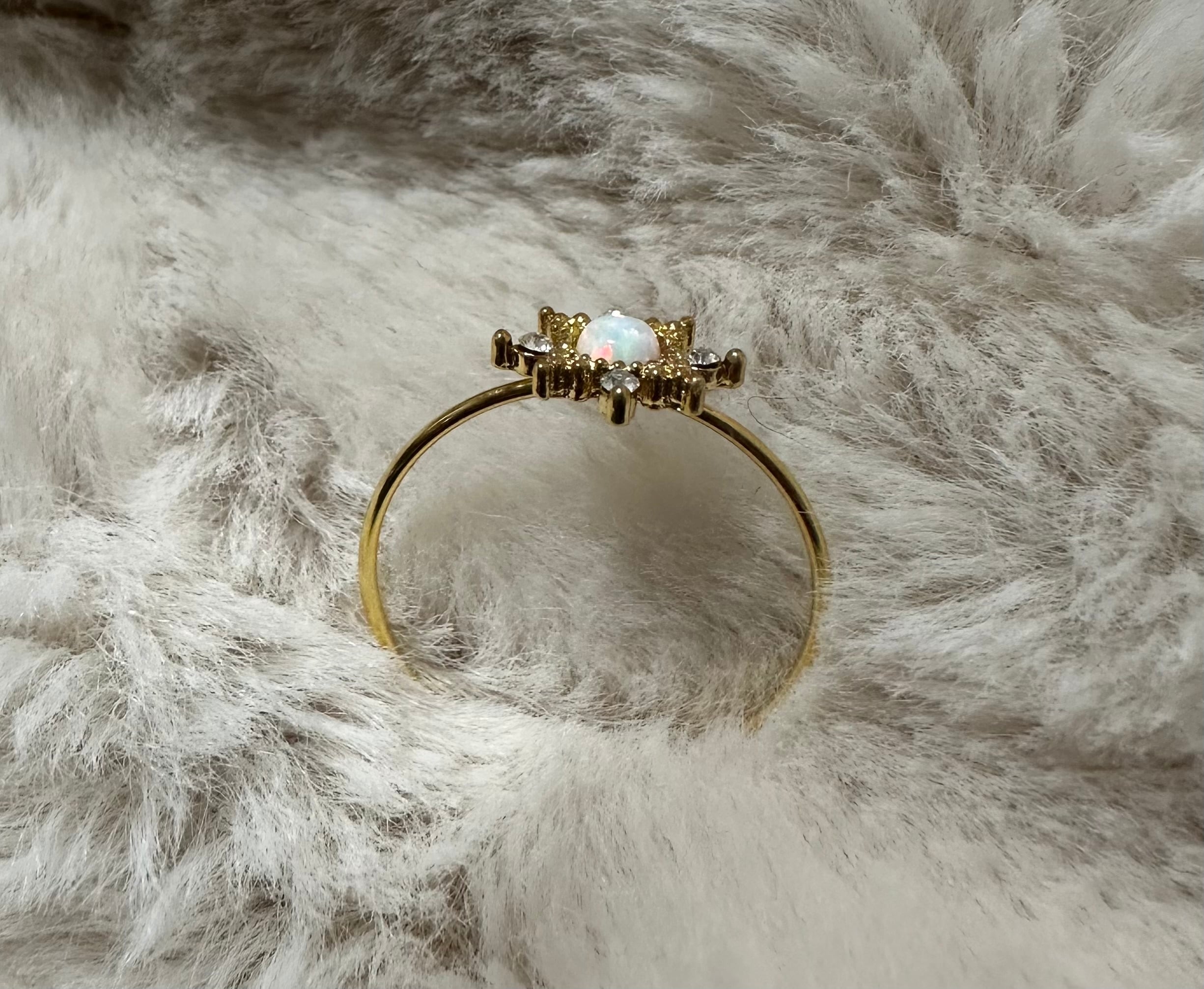 中央のオパールを雪の結晶のように囲む繊細なゴールドの花びらと、輝く小さなキュービックジルコニアが、まるで「冬の雪に虹が降り積もった」ような幻想的なデザイン。