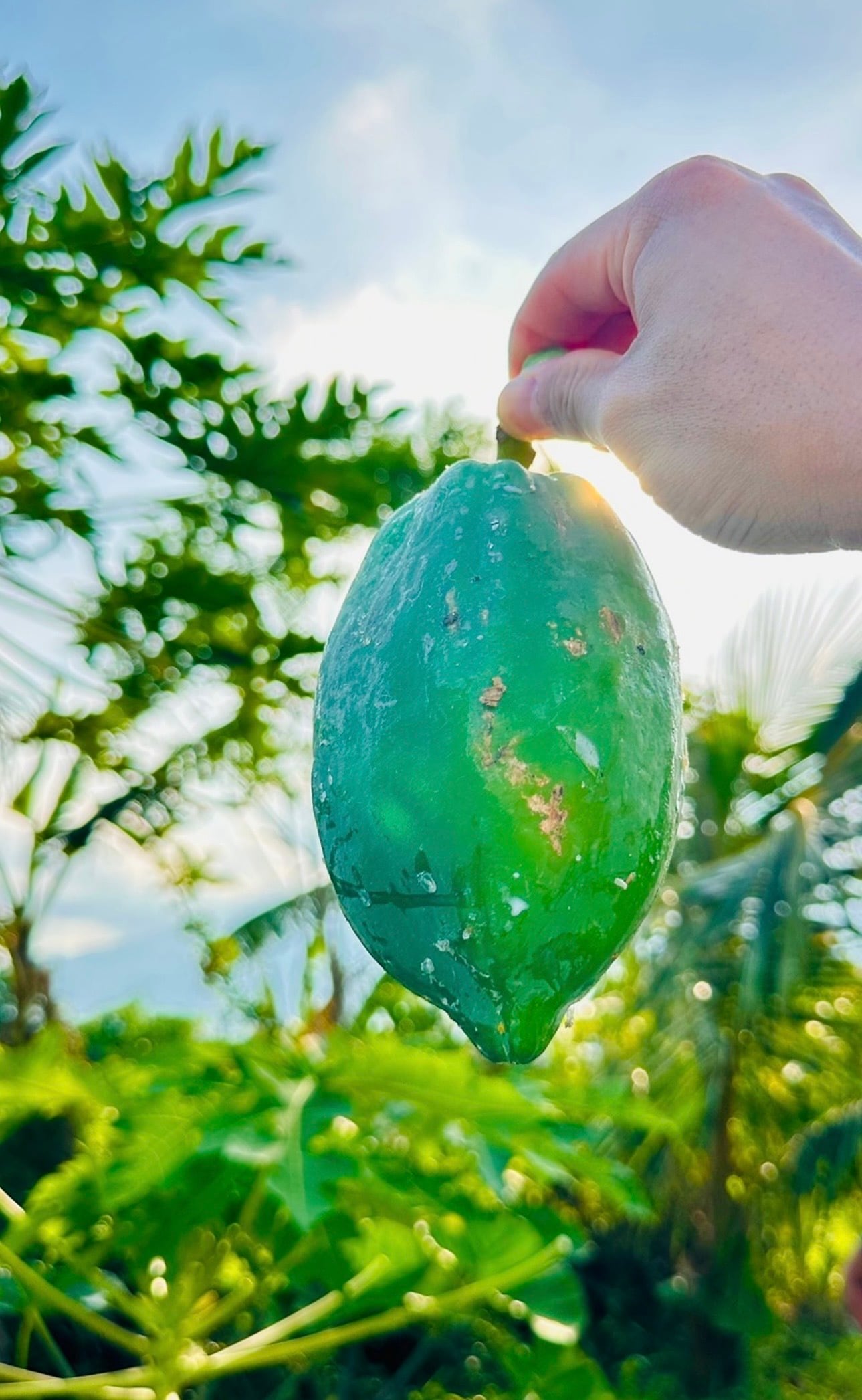 青パパイヤは、土の深いところから根を張り、太陽と大地のエネルギーを存分に吸収しながら育ちます。
